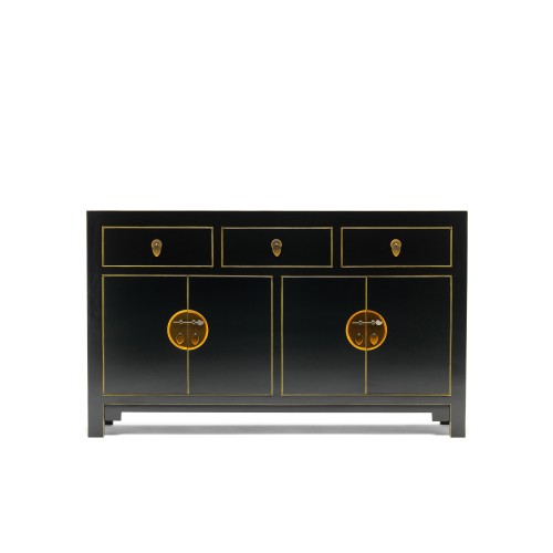 A stunning large Chinese sideboard in black with gold leaf edging The beautiful gloss finish is complimented by gilt edging and antiqued metal work A perfect statement piece delivering ample, yet stylish storage for any room The overall dimensions of the sideboard are H85 x W140 x D35 cm The sideboard has three large drawers, and four doors opening to substantial cupboard space Each drawer has internal dimensions: W37.5 x H12.5 x D30 cm Each shelf has a height of 22cm and the overall internal measurements of both cupboards are H44 x W67 x D31 Crafted from poplar wood and plywood Exceptional b...