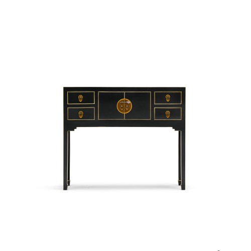A small Chinese console table in black with gold leaf edging The beautiful gloss finish is complimented by gilt edging and antiqued metal work This versatile piece can be used as a console table or dressing table and offers flexible storage while being narrow enough to fit in any hallway The overall dimensions of the table are H80 x W100 x D25 cm The table has four drawers and a small cupboard for convenient storage Each drawer has internal dimensions: W19 x H9 x D21 cm The cupboard has internal dimensions: W44 x H26 x D22 cm Crafted from poplar wood and plywood Exceptional build quality thro...