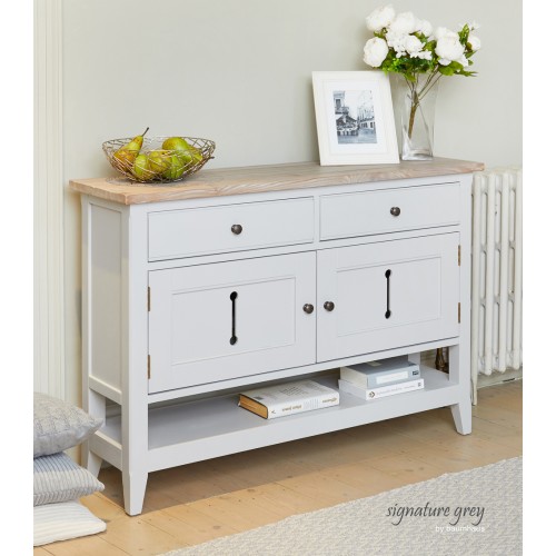 A small sideboard / console table with a cupboard, two drawers and an open shelf for superb flexible storage The key feature to this collection is the exquisite hand-distressing on the grey limed tops, which is carried out by skilled craftsmen to create the unique eye-catching appearance that makes this collection so distinctive Combining timeless elegance with a warm, homely quality, the Signature range is modern classic furniture at its absolute finest This product is painted in modern grey using our six stage paint process, ensuring the best appearance and resilience to everyday use Ornate cut-outs in the two doors add extra stylish flair, while cleverly providing ventilation Fitted with distressed bronzed hardware which complement this collection beautifully Manufactured using solid wood throughout The overall dimensions of the sideboard are H80 x W120 x D35 cm Two doors open onto a cupboard, with internal measurements of H32 x W105 x D20 cm Two large drawers have internal measurements of H13 x W51.5 x D20 cm The open shelf at the bottom is perfect for shoes, or to display items The open shelf measures H12.5 x W105 x D24 cm Designed and built to last a lifetime This is a solidly constructed piece of furniture and no assembly is required Comes with a FIVE YEAR warranty against all manufacture related issues Heavy duty packaging Part of our elegant Signature furniture collection