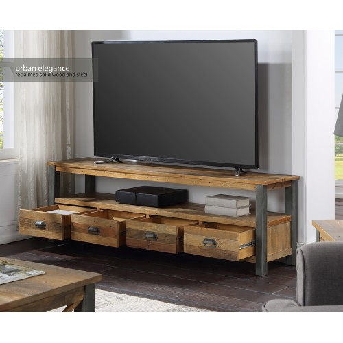 This large TV cabinet/ AV Unit features a long open shelf and four drawers Our divine Urban Elegance range is sturdy and versatile with enough rustic charm to soften the industrial edge, creating charming furniture that would suit any home The distressed, powder coated steel frame ensures an attractive matt finish, which combines beautifully with the solid reclaimed rough sawn wood Featuring a stylish cross design in the frame, these pieces will be a focal point in any room As each item in the range is built using a unique blend of reclaimed timbers and then hand finished by skilled craftsmen, every piece is truly individual The wood is finished with a resilient satin lacquer which is hard wearing, yet enhances and highlights the unique imperfections such as knots and grain patterns in the timber The overall dimensions of the large TV cabinet are H55 x W180 x D40 cm Four drawers offer plenty of storage for DVD's and remote controls The drawers have internal dimensions of H16.5 x W39 x D29cm The open shelf has plenty of space to fit multiple ancillary units The shelf has internal dimensions H18 x W165 x D40 cm The unit is delivered fully assembly Distressed handles match the matt steel frame Solidly constructed, designed and built to last a lifetime Environmentally friendly, using reclaimed timber Exceptional build quality; designed to last a lifetime Heavy duty packaging Comes with a FIVE YEAR warranty against all manufacture related issues Take a look at the rest of our exclusive Urban Elegance range for fantastic matching pieces