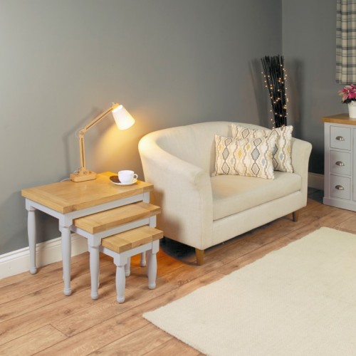 A set of three lovely nesting tables that will be a welcome addition in your home Part of our fresh and elegant grey painted Chadwick range Beautifully crafted painted furniture with carefully selected satin lacquered oak veneer tops Exceptionally built throughout The overall dimensions of the individual tables are: Large H52 x W62 x D44cm, Medium: H42 x W46 x D37cm and Small H33,5 x W30 x D30cm The tables slot inside each other to minimise the amount of space taken These are solid items, no assembly is required Heavy duty packaging ...