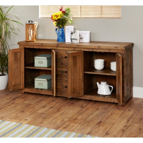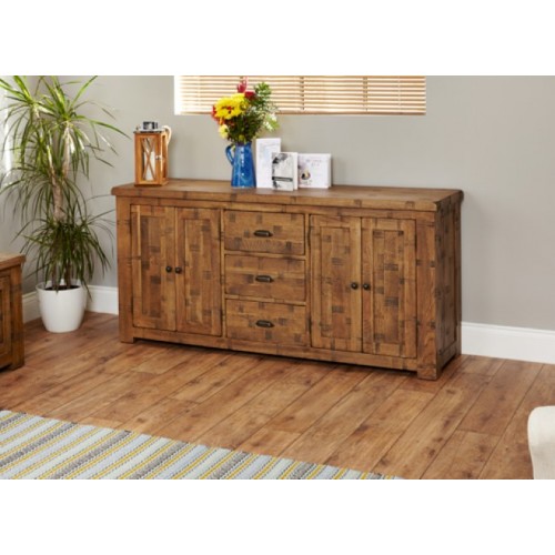A large and uniquely designed sideboard offering excellent storage for your living space From our eye-catching Heyford rough sawn oak range Carefully crafted using rough sawn oak and hardwood panels Exceptionally built throughout This sideboard has three drawers and two cupboards, each with two shelves The overall dimensions of the sideboard are H75 x W160 x D44 cm The internal dimensions of the cupboards are H58 x W66 x D33cm The internal dimensions of the drawers are W14.5 x H15 x D39.5cm The drawers are constructed using dovetail joints Panelled sides add design detail Tongue and groove ha...