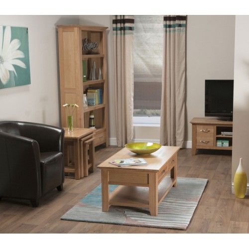 The Sherwood Oak range is made of a high quality grade of oak and exhibits all the hallmarks of quality furniture.These include wood-panelled drawer bases and cabinet backs and the use of dovetailed joints in constructing drawers.Sherwood Oak furniture features a decorative curved beading to the underside of cabinet tops and chamfered, rather than square finished leg ends to all floor-standing cabinets.Sherwood Oak furniture has a light oak appearance and is finished in a hard-wearing, satin lacquer finish. Carefully selected oak veneers are used in the side panels of certain items with the Sherwood Oak range.