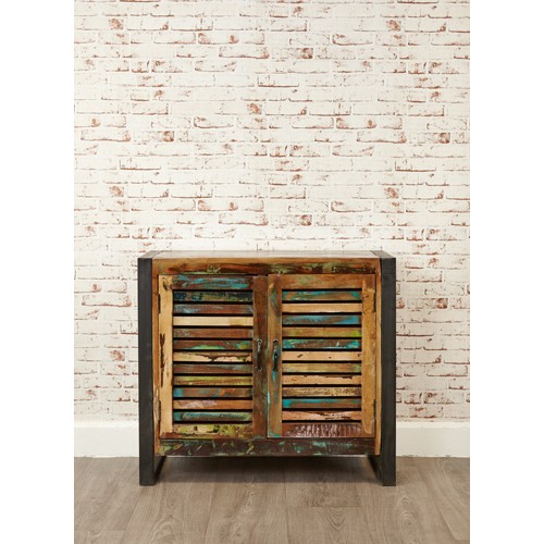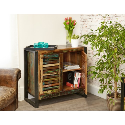 Unique contemporary small sideboard The exclusive Urban Chic range is made using reclaimed wood salvaged from old buildings in places such as Gujarat, Maharashtra and Rajasthan Southern India Some of the wood used can be between 50 and 150 years old and is assembled by skilled craftsmen who create this colourful and interesting furniture As each piece in the range is hand finished using a unique blend of reclaimed timbers, every item is truly individual A beautifully made steel outer frame gives a fantastic urban edge and offers great structural rigidity The overall dimensions of the sideboa...