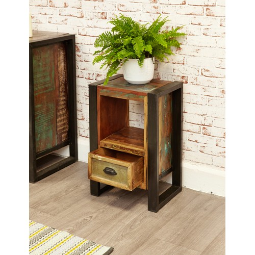 Unique contemporary lamp table / bedside cabinet The exclusive Urban Chic range is made using reclaimed wood salvaged from old buildings in places such as Gujarat, Maharashtra and Rajasthan Southern India Some of the wood used can be between 50 and 150 years old and is assembled by skilled craftsmen who create this colourful and interesting furniture As each piece in the range is hand finished using a unique blend of reclaimed timbers, every item is truly individual A beautifully made steel outer frame gives a fantastic urban edge and offers great structural rigidity The overall dimensions o...