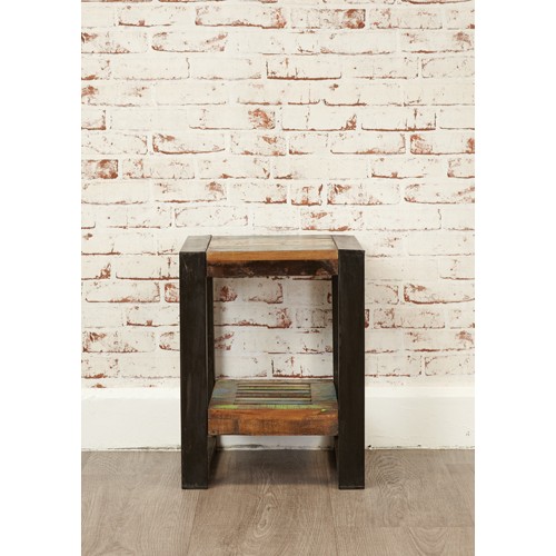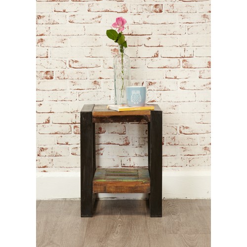 Unique contemporary low plant stand / lamp table The exclusive Urban Chic range is made using reclaimed wood salvaged from old buildings in places such as Gujarat, Maharashtra and Rajasthan Southern India Some of the wood used can be between 50 and 150 years old and is assembled by skilled craftsmen who create this colourful and interesting furniture As each piece in the range is hand finished using a unique blend of reclaimed timbers, every item is truly individual A beautifully made steel outer frame gives a fantastic urban edge and offers great structural rigidity The overall dimensions o...