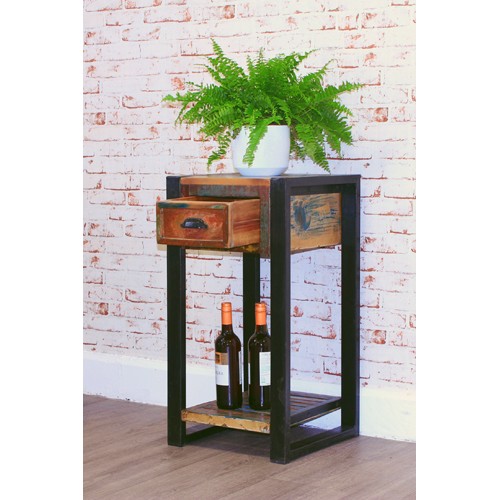 Unique contemporary one drawer plant stand / lamp table The exclusive Urban Chic range is made using reclaimed wood salvaged from old buildings in places such as Gujarat, Maharashtra and Rajasthan Southern India Some of the wood used can be between 50 and 150 years old and is assembled by skilled craftsmen who create this colourful and interesting furniture As each piece in the range is hand finished using a unique blend of reclaimed timbers, every item is truly individual A beautifully made steel outer frame gives a fantastic urban edge and offers great structural rigidity The overall dimen...