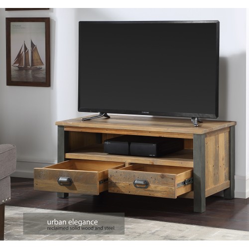This lovely TV cabinet/ AV Unit features an open shelf and two storage drawers Our divine Urban Elegance range is sturdy and versatile with enough rustic charm to soften the industrial edge, creating charming furniture that would suit any home The distressed, powder coated steel frame ensures an attractive matt finish, which combines beautifully with the solid reclaimed rough sawn wood Featuring a stylish cross design in the frame, these pieces will be a focal point in any room As each item in the range is built using a unique blend of reclaimed timbers and then hand finished by skilled craftsmen, every piece is truly individual The wood is finished with a resilient satin lacquer which is hard wearing, yet enhances and highlights the unique imperfections such as knots and grain patterns in the timber The overall dimensions of the TV cabinet are H47 x W100 x D45 cm Two drawers offer plenty of storage for DVD's and remote controls The drawers have internal dimensions of H14 x W42 x D34cm The open shelf has a hole to feed cables through and space to sit your Sky box, DVD player etc The shelf has internal dimensions H14 x W88 x D34 cm The unit is delivered fully assembly Distressed handles match the matt steel frame Solidly constructed, designed and built to last a lifetime Environmentally friendly, using reclaimed timber Exceptional build quality; designed to last a lifetime Heavy duty packaging Comes with a FIVE YEAR warranty against all manufacture related issues Take a look at the rest of our exclusive Urban Elegance range for fantastic matching pieces